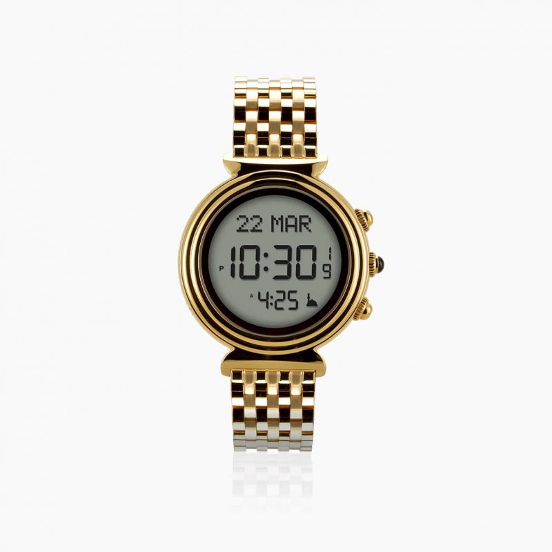 ساعة يد نسائية ذات إطار ذهبي لماع، مزودة بشاشة مع إضاءة خلفية، مع سوار ذهبي