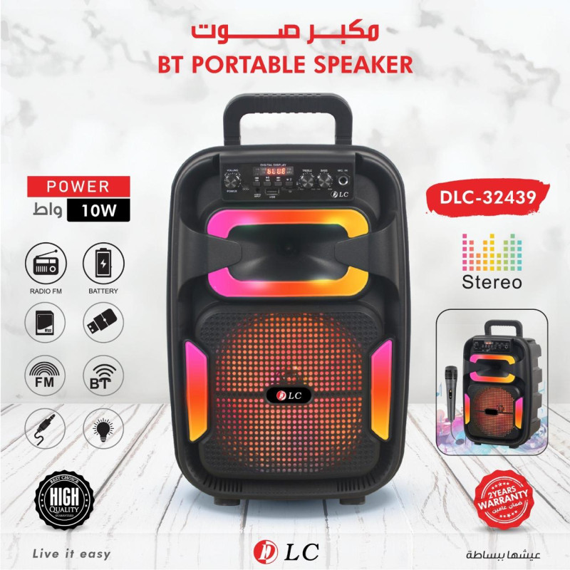 مكبر صوت لاسلكي مصمم للحفلات والمناسبات الصغيرة، يجمع بين الأداء الجيد والتصميم العملي. مزود بإضاءة LED ملونة وميكروفون، ويعمل بتقنية البلوتوث لتشغيل الموسيقى لاسلكيًا. يحتوي على بطارية قابلة لإعادة الشحن بمدة تشغيل تصل إلى 3 ساعات.