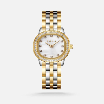 - إطار الساعة من الستيل باللون الذهبي الفاخر والمرصع بفصوص الزركون البراقة