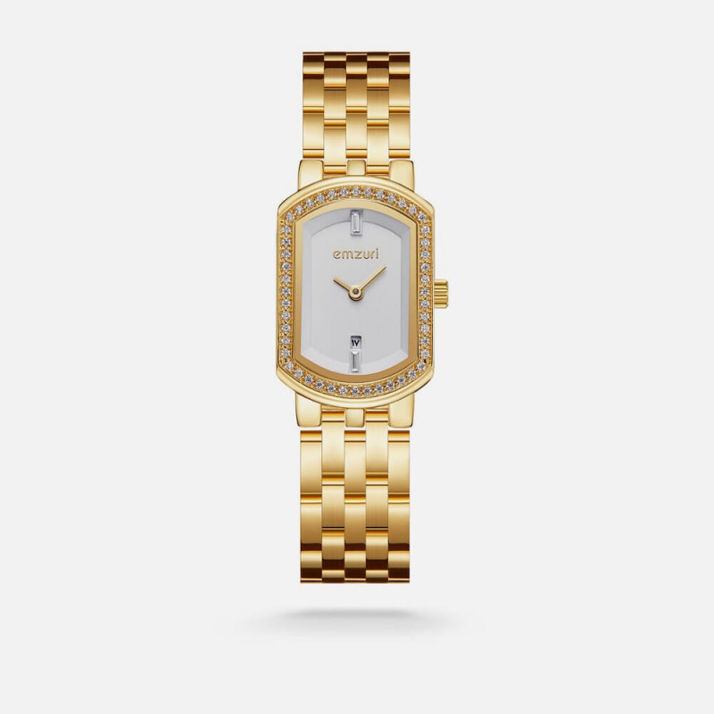 ساعة نسائيه من ماركة إيمزوري ، ساعه تتميز بلمسه من الأناقه العصريه ، صممت الساعة بشكل عصري خفيف يناسب مختلف الأوقات ، ساعه بسوار من الستانلس ستيل باللون الذهبي ، تتميز الساعه بالميناء بشكل هندسي بلون أبيض وبنافذه صغيره لعرض التاريخ وبإطار مرصع بفصوص من الزركون البراق وبفصين كبيره من الزركون على أرض الميناء ، إختيارك لهذه الساعه سيكون الإختيار المفضل لك لإطلاله كل يوم ، لا تترددي في إضافه الساعة لمجموعتك المفضله .