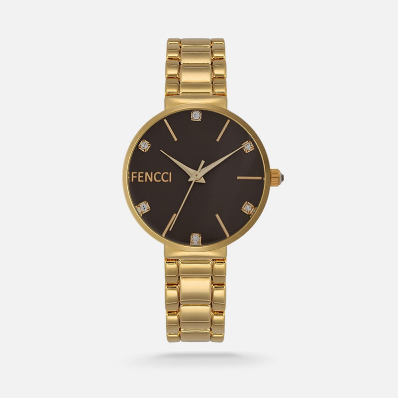 صممت ساعة فنشي بتصميم كلاسيك بميناء باللون البني ومزين بفصوص زركون لامعه في مكان الأرقام ، ساعة ناعمه بميناء بسيط يعطي إنطباع انثوي أنيق ، ساعه جذابه تناسب إطلاله بفستان ناعم لتبرزي جماله ، تناسب هذه الساعة إطلالتك في كل الأوقات الساعة ضد الماء . ضمان لمدة سنة