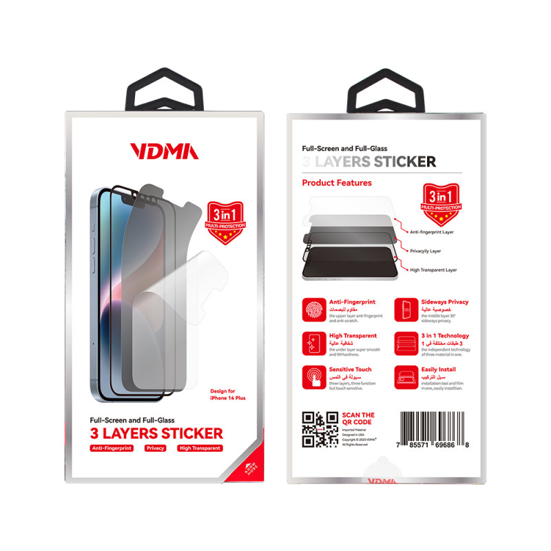 - -استيكر حماية امامية VDMA مبتكرة و مصنعة من اجود الخامات ذات الجودة العاليه وفق المعايير المرغوبة , بثلاث طبقات , طبقة شفافة , طبقة خصوصية ( لقافة) , طبقة ضد البصمات .